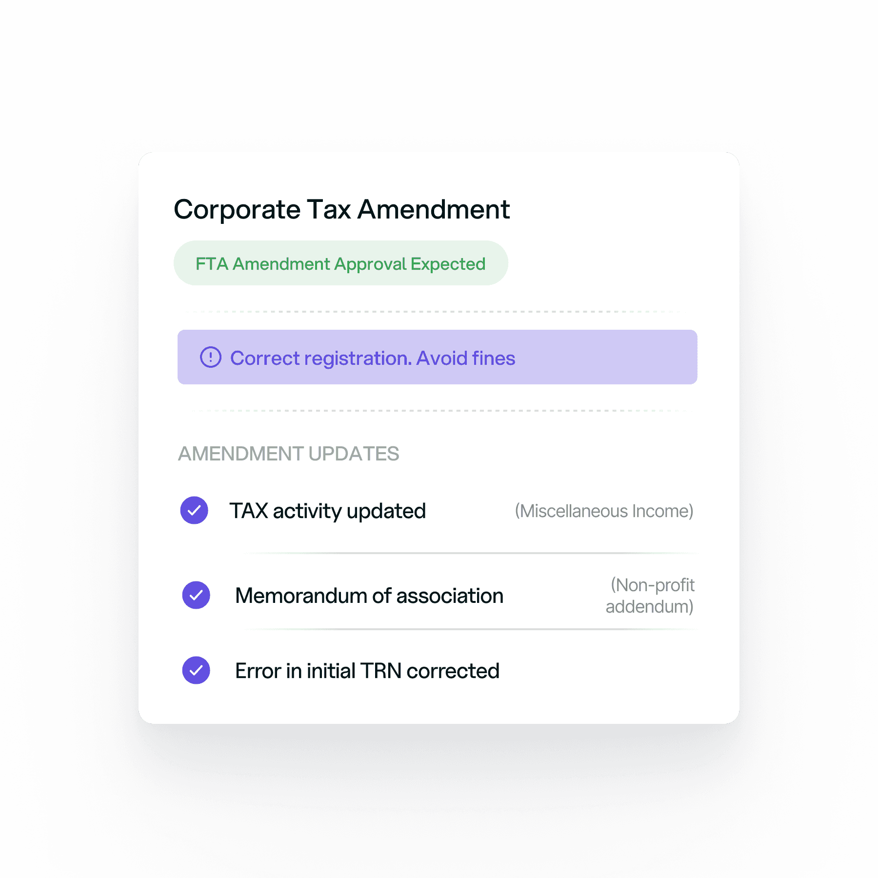 Not every business update needs FTA reporting. Paci reviews your specific situation to confirm whether your changes trigger mandatory amendment filing. You must file a corporate tax registration amendment for legal or trading name changes, principal business address relocations, primary business activity shifts, trade license renewals or modifications, authorized signatory replacements, ownership structure adjustments, and updated contact details that no longer match FTA records. Filing amendments for non-reportable changes wastes time and creates unnecessary paperwork. Our team identifies exactly what FTA requires so you submit only mandatory updates.